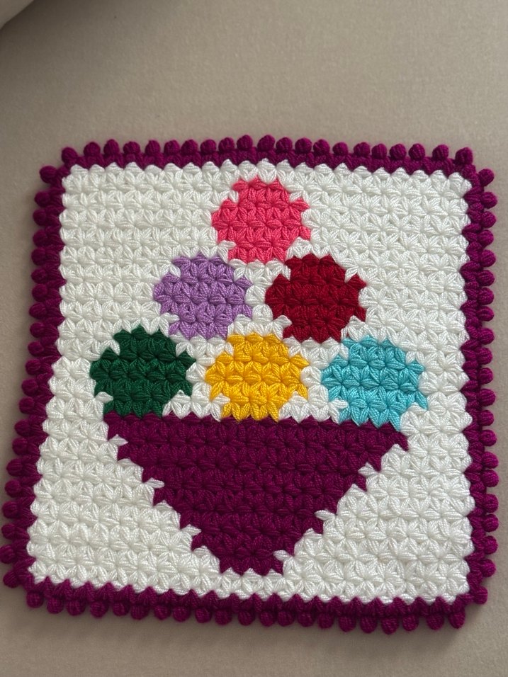 Renkli ve dokulu örgü desene sahip el yapımı banyo süngeri, banyonuza neşeli bir hava katar.