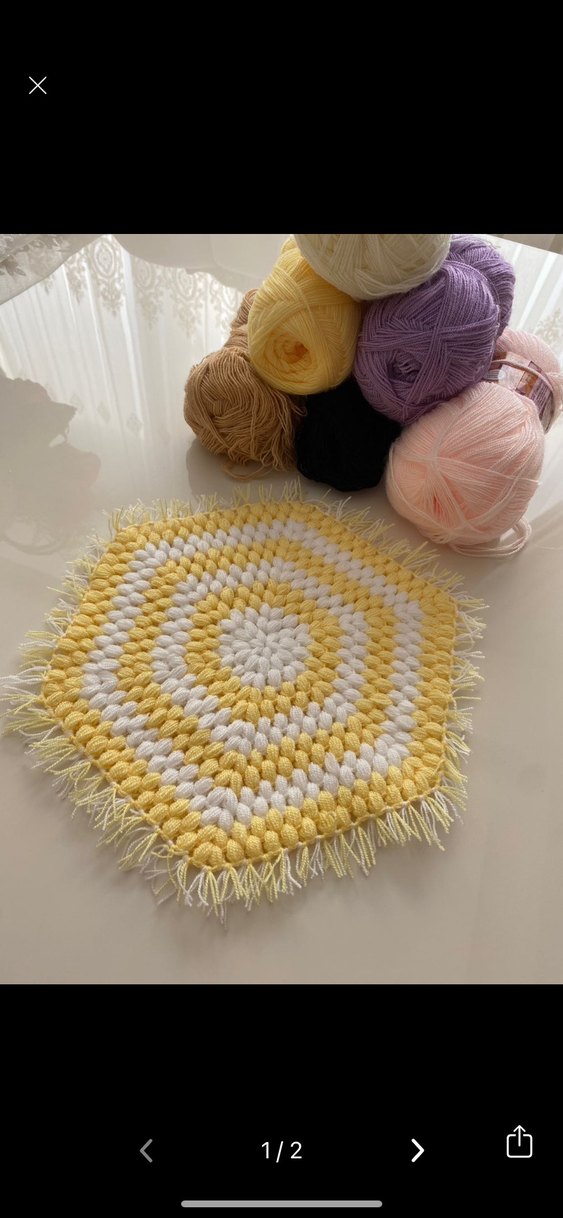 Sarı ve beyaz renklerde, yumuşak iplikten yapılmış, püsküllü kenarları olan altıgen çeyizlik lif istenilen renkte örülür sıfır ürün