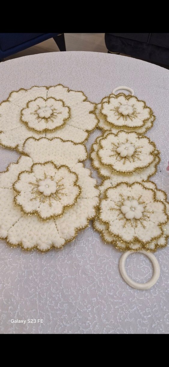 Altın kenar detaylı, boncuk süslemeli beyaz örgü