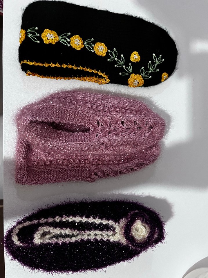 Nakışlı çiçek desenli, koyu çok renkli kız çocukları için örgü ev terlikleri. Geleneksel tarzda, modaya uygun ve öncü bir tasarıma sahiptir.