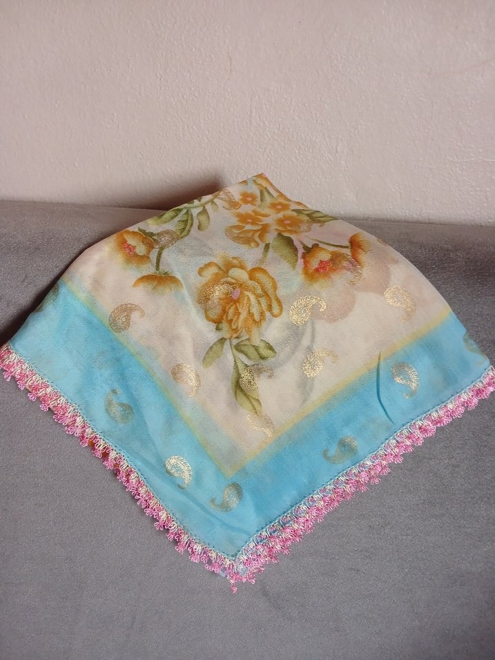 Çiçek desenli çok renkli pastel tekstil kumaştan, dantel detaylı kadın fularıdır. Bohem tarzını yansıtır.