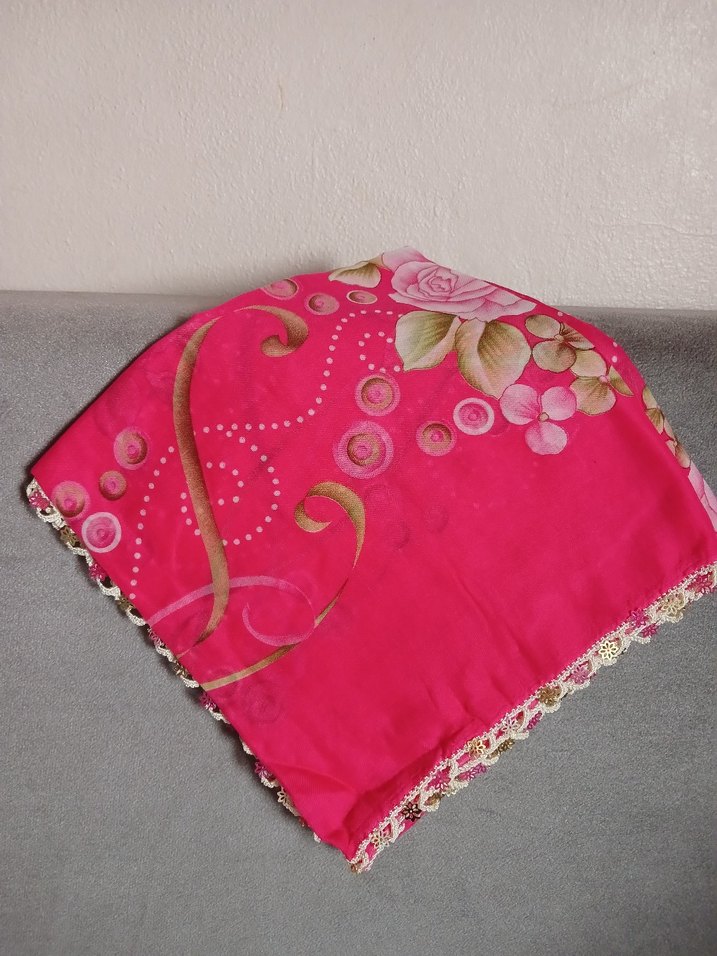 Dantel kenarlı, çiçek desenli parlak pembe ipek görünümlü kadın fular.