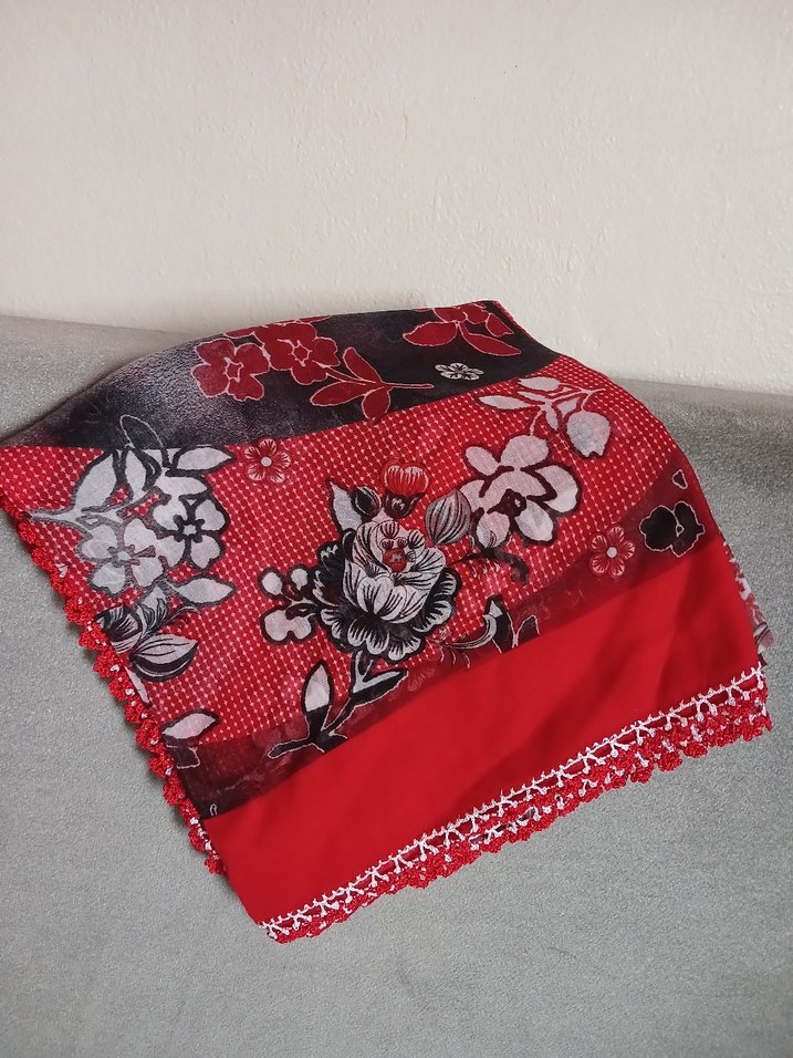 Koyu kırmızı renkli, çiçek desenli ve dantel kenarlı kadın şalı, rahat ve bohem tarzda.