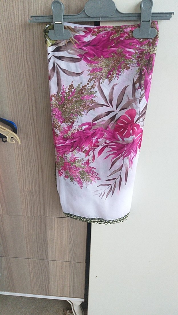Kadınlar için hafif pembe çiçek desenli, sentetik kumaştan bohem tarzda drapeli fular.