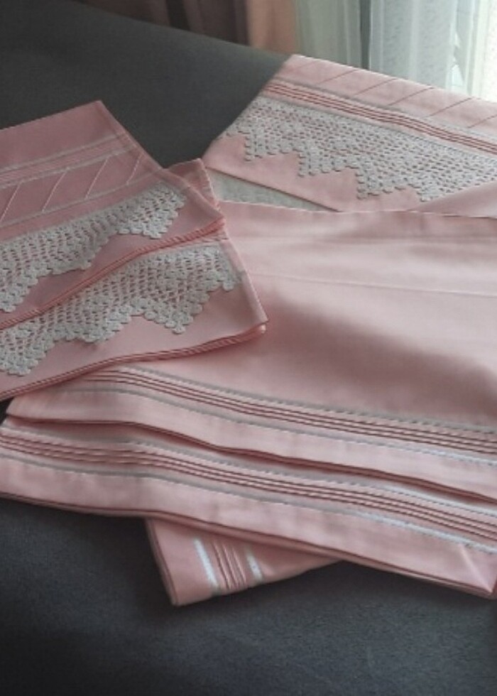 Özel bir dikimevine diktirildi. Kullanılan pembe kumaş tiril tiril bir ipek saten. Sıfır durumda paketinin içinde duruyor. Takımın içinde; -1 Adet Pike -1 adet ipek saten pembe çarşaf -2 adet ipek saten pembe yastık kılıfı -2 adet ipek saten dantelli yastık kılıfı bulunmaktadır. Alıcısına şimdiden hayırlı olsun