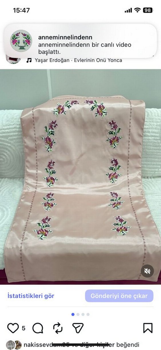 Pastel pembe renkte, ipeksi dokulu ve çiçek nakışlı seccade