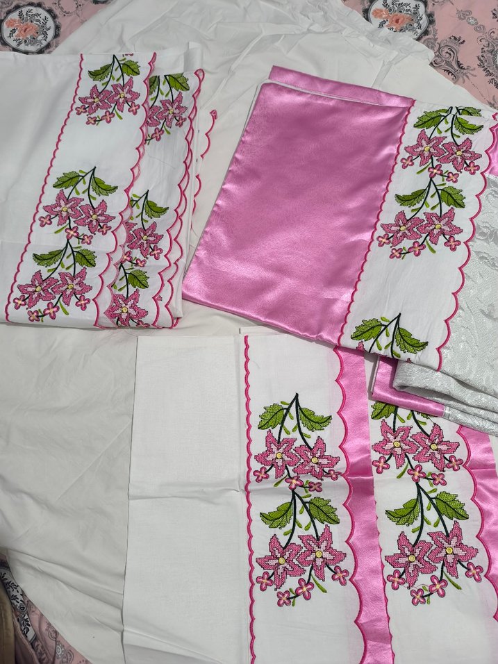 hiç kullanılmadı çift kişilik pamuklu kumaş 2 yastık kılıfı bir çarşaf bir nakışlı çarşaf ve 1 adet pike olmak üzere settir nakışlı çarşaf iki kenardır kenarlarında gösterdiğim kadar boşluk vardır çarşaflar lastiksizdir hiçbir deformesi yoktur.