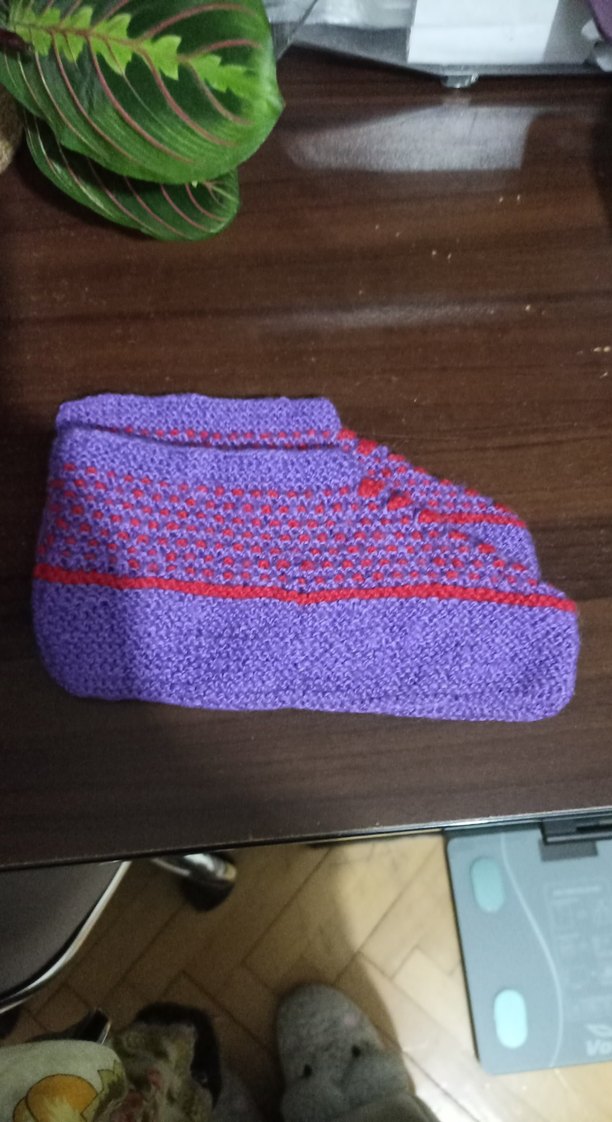 Mor triko kız ev terliği, yumuşak örme kumaştan yapılmış, sade ve renkli tasarımıyla sıcaklık ve konfor sağlar.