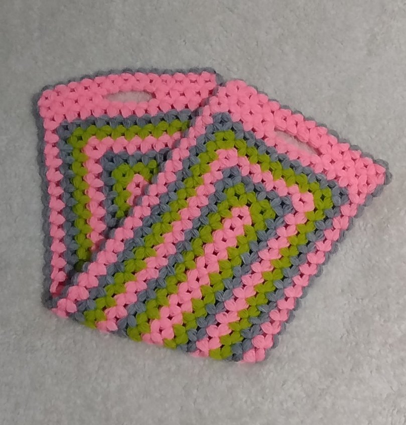 Pembe, yeşil ve gri tonlarda dokuma desenli renkli banyo lifi. Yumuşak ve kullanışlıdır.