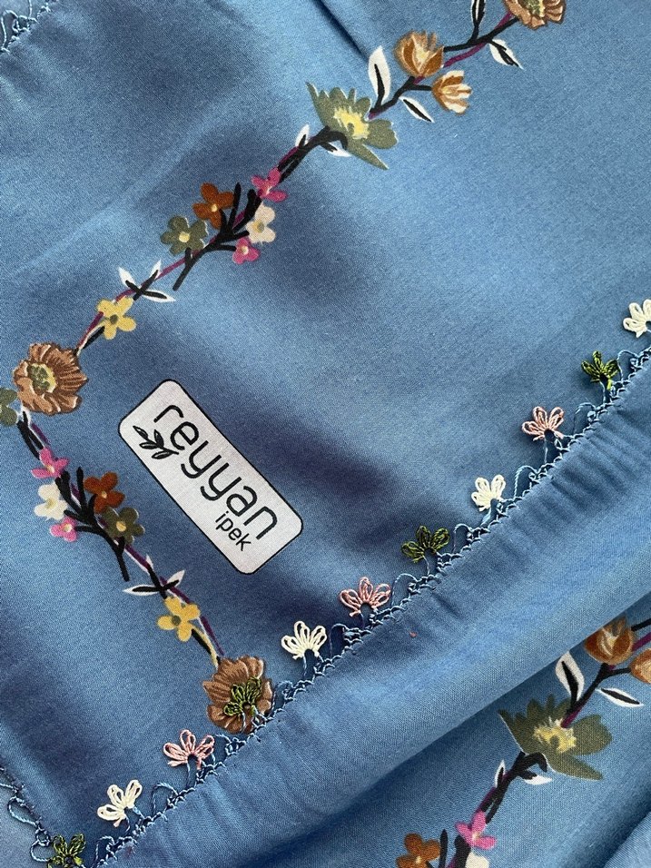 Mavi tekstil kumaştan, dantel kenarları ve çiçek işlemeleriyle bohem tarzı yansıtan pastel tonlarda kadın şalı.