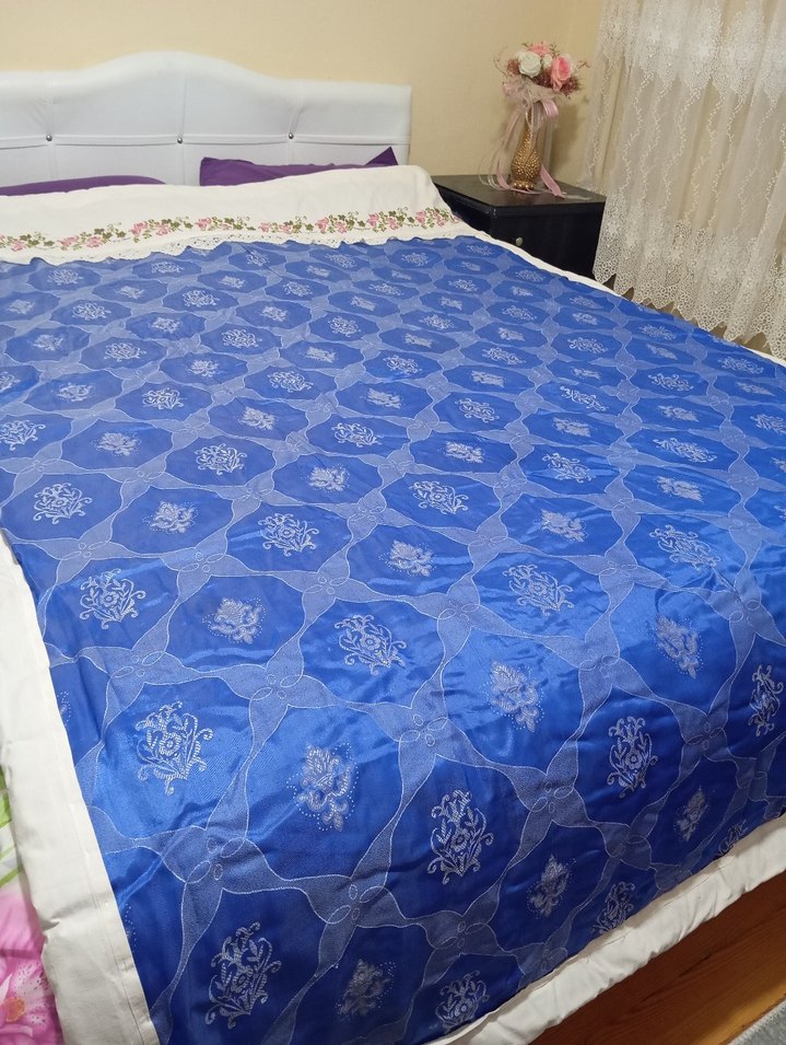 Sıfır üründür içi pamuk olup çok ağır değildir. ölçüleri 160*230 dur . baş kısmındaki kanaviçe el işlemesidir