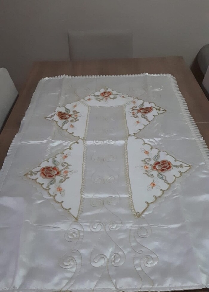 Hiç kullanılmadı saten krem rengi nakış işlemeli çeyizlik seccade