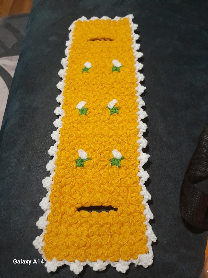 Beyaz kenar süslemeleri ve küçük çiçek detayları olan sarı el yapımı banyo süngeri. Yumuşak dokuludur.