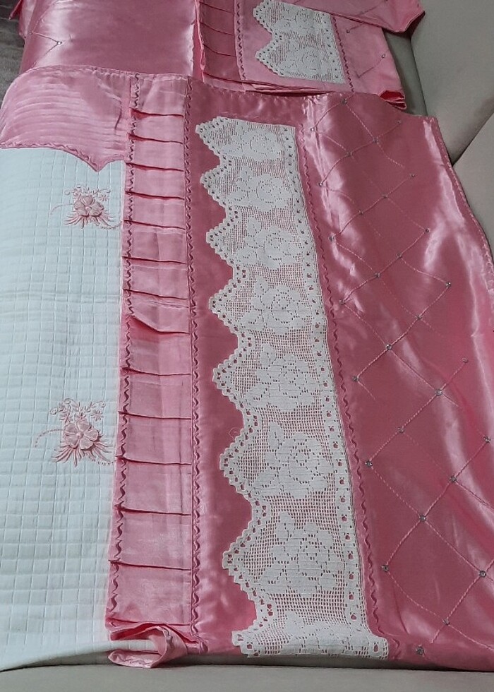 hic kullanılmadı fakat pikenin ayak ucuna doğru sandık lekesi oluşan bi yer var yastıgının birinde de minik bir leke var küçük bir işlemle çıkar. Cok degerli ve ağır bir takımdır. Pamuk saten kumasi var. danteli el emeği. Taşları dikimdir. 1 adet 200×220 pike 1 adet 220×230 çarşaf 2 adet yastık vardır #çeyizlik #pikolu #piketakımı #dantelli #taşlı #tasli #pembe