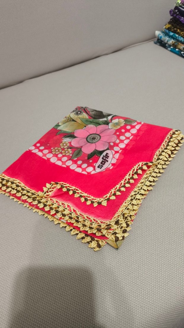 Renkli çiçek desenli pembe tekstil kumaştan, dantel detaylı bohem ve retro tarzda kadın başörtüsü tülbent sıfır