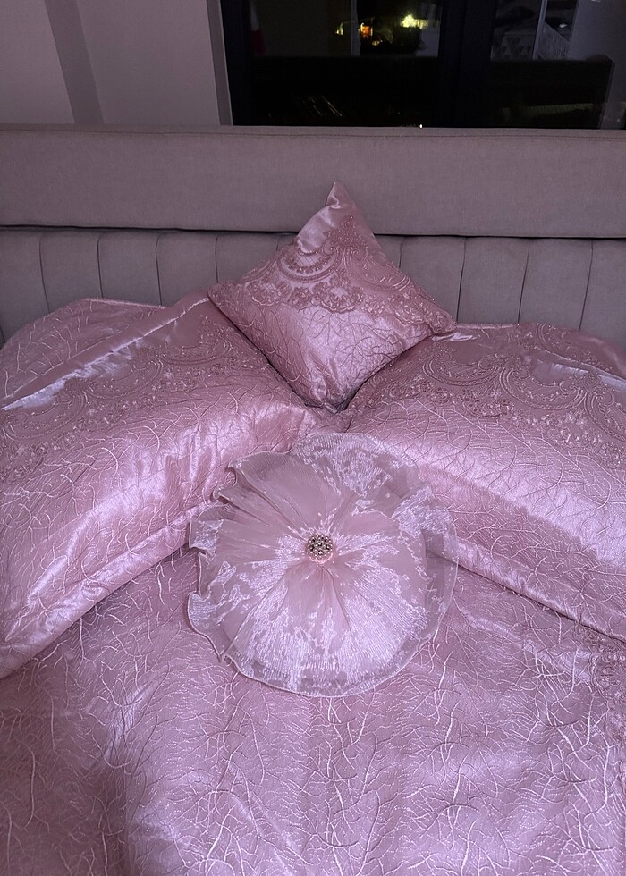 Sadece 1 defa çeyiz sermede kullanilmistir. Tertemiz çok şık yatak örtüsü fotoda görünen tüm parcalari mevcuttur.Marka temsilidir.