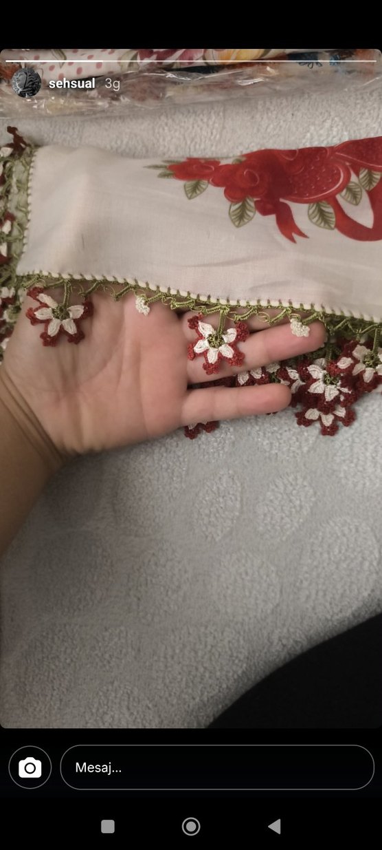 Beyaz tekstilden yapılmış, dantel ve çiçek motifli kroşe detaylara sahip bohem, hippie tarzı kadın şalı.