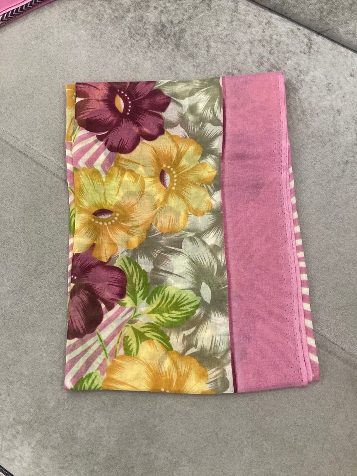 Kadınlar için çiçek desenli, pileli fular. Sarı, mor ve yeşil çiçekler gri zemin üzerinde, pembe kenarla birleşiyor. Yumuşak sentetik kumaştan, bohem ve rahat tarzda.