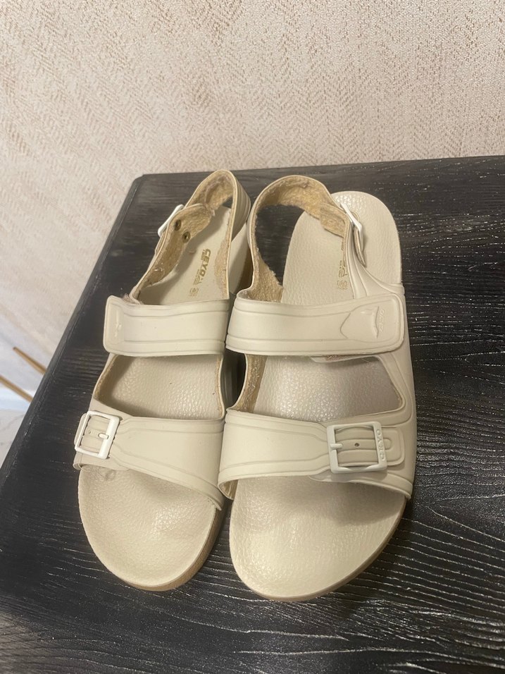 Bej renkte, #ceyosandalet #ceyoterlik #ceyo tokalı bantlara sahip kadın sandaletleri. Kauçuk malzemeden yapılmış, sade ve minimalist tasarıma sahiptir.