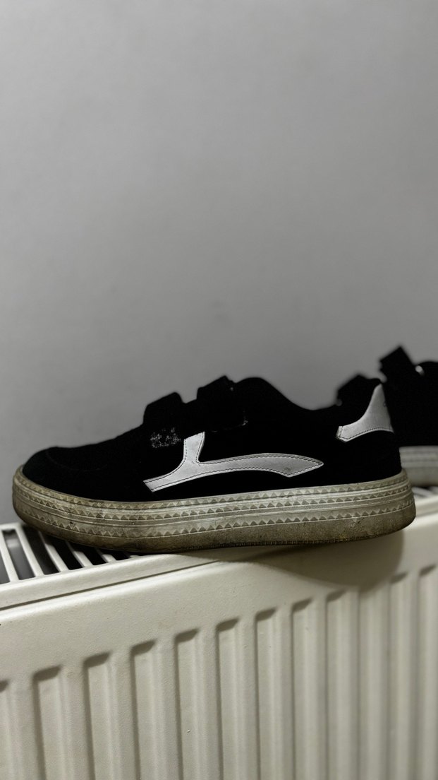 beyaz detaylı siyah cocuk spor ayakkabısı, cırt cırtlı bantlarla ve kauçuk tabanli
