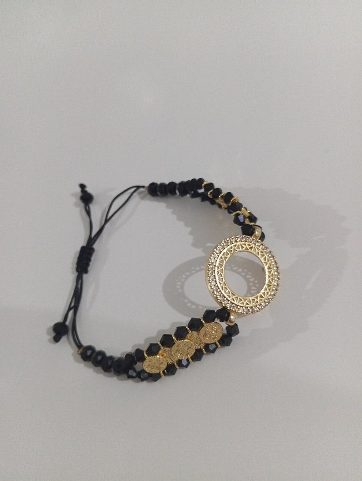 Kadınlar için siyah boncuklu ve detaylı desenli altın renkli yuvarlak merkez parça içeren bohem tarz bileklik. Günlük kullanım için uygun.