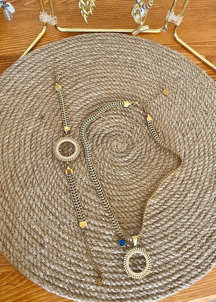 Bileklik ve bir kolyeden oluşmaktadır set , içerisine çeyrek altın koyuyorsunuz ve kullanıyorsunuz , kararmaz , lüx çeliktendir , Düğünlerde geline çeyrek hediye takılırken bu şekilde hediye de edebilirsiniz . Defosu yoktur.