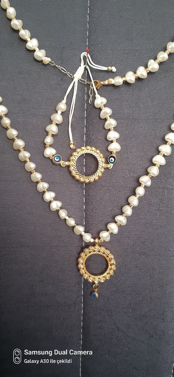 Çeyrek uyumlu Beyaz inci Boncuklu Gelin Kolyesi ve bileklik