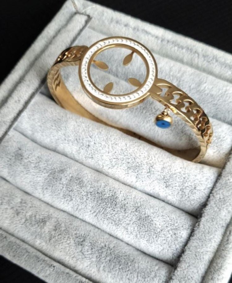 Altın renkli kadın bileklik, minimal tasarım ve payet detaylarıyla renkli yılan deseni sunar. Günlük kullanıma uygun, çağdaş ve bohem tarzda. baştaki iki tanesi çeyrekli sondaki yarım uyumlu kargo dahil fiyattır