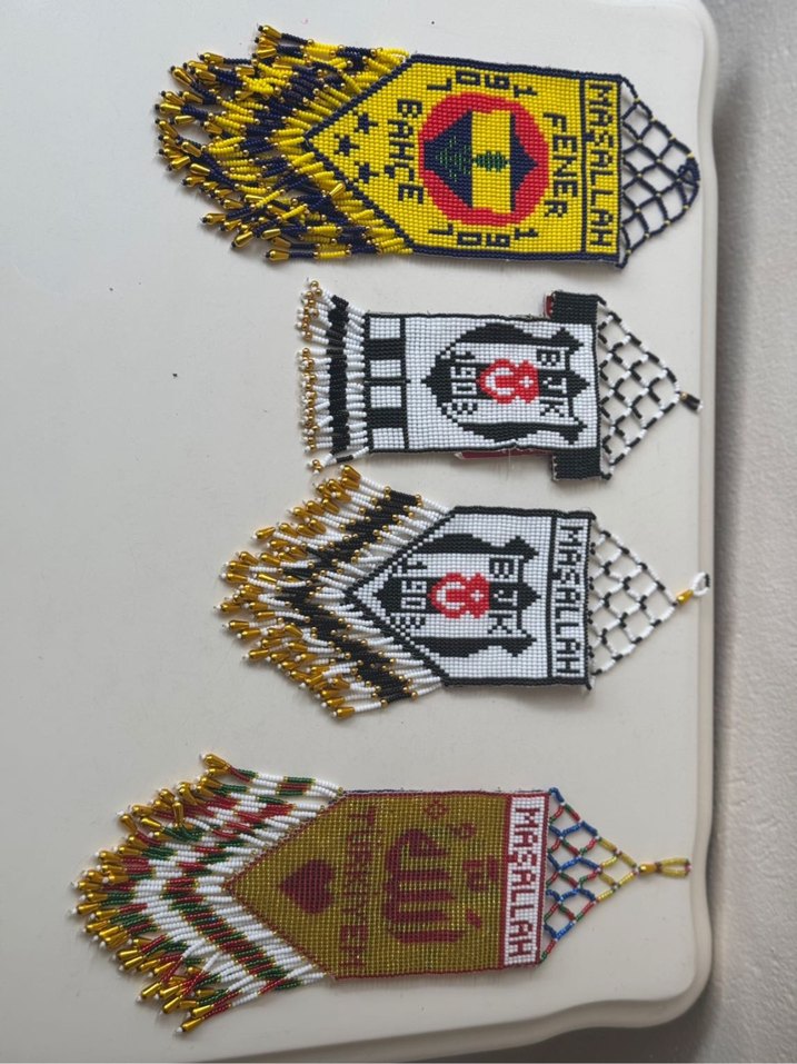 1. 6002.500 3.550 4.500 tl dir . %100 el yapımıdır, cezaevi işi olarak üretilmiştir. Dayanıklı boncuklardan tasarlanmış olup uzun ömürlüdür. Araba aynasına asılabilir ve dekoratif amaçlı kullanılabilir. FB ve BJK taraftarlarının tutkularını yansıtır ve özel bir hediye seçeneğidir. En 6 cm genişlik 18 cm çift taraflı örgü kullanılmıştır