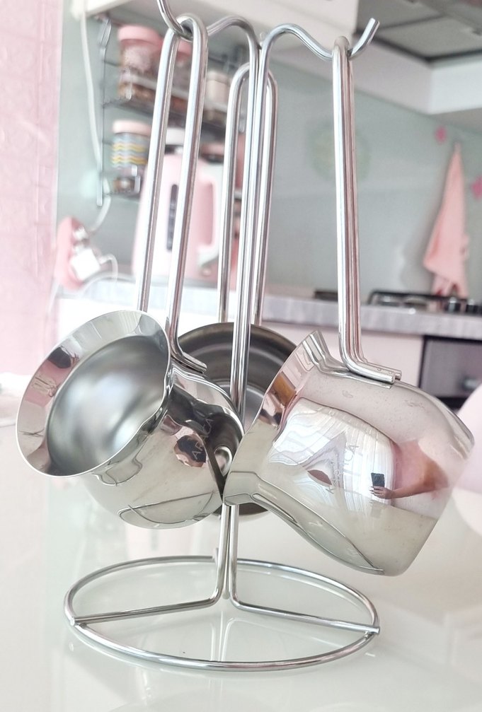Uzun saplı paslanmaz çelik cezve ve kolay saklama için standı ile mutfak düzeni sağlar.