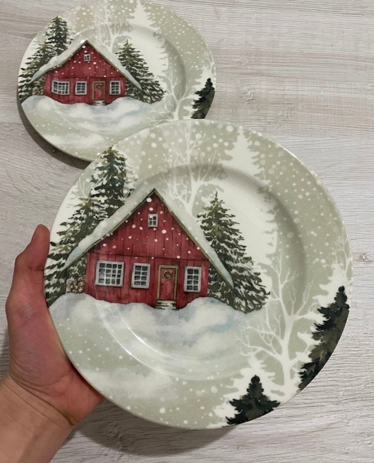 Karlı manzara, kırmızı ev ve çam ağaçları desenli yuvarlak tabaklar, kış dekorasyonu için uygundur. ❄️