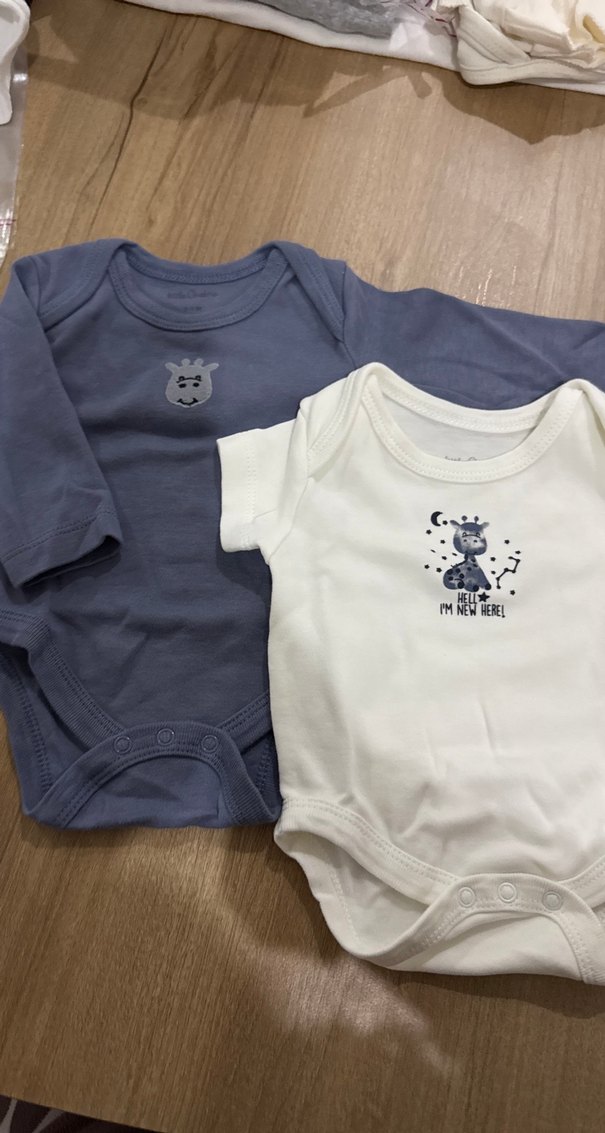 Yumuşak pamuktan yapılmış, biri gri-mavi diğeri beyaz renkli, baskılı hayvan desenli kısa kollu bebek bodyleri. Yuvarlak yakalı ve çıtçıtlı kapanışlı. Kumaşları bambu pamukludur tertemiz durumdadır
