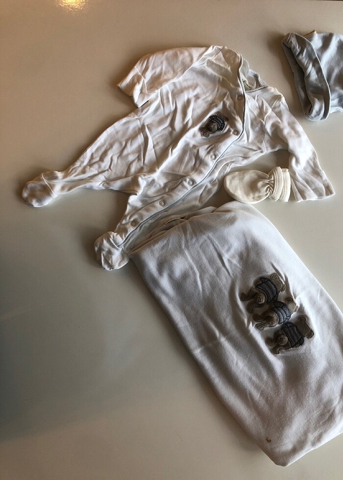 Battaniyesinde bir kücük leke var yıkanırsa cıkar şapkası ve tulumu var takım. Eldiveni mevcut