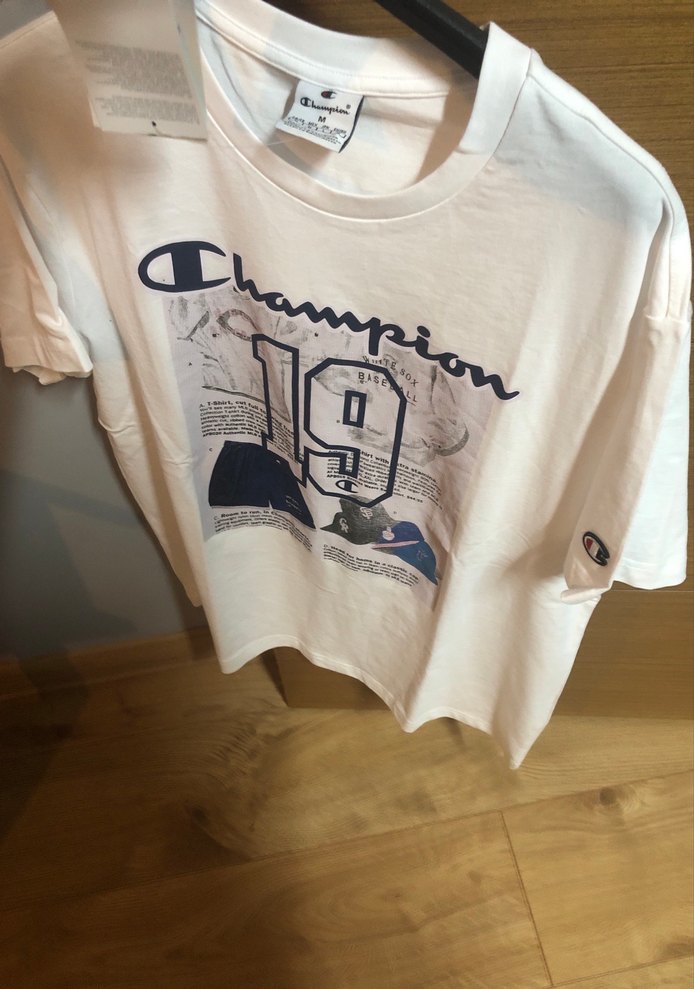 Champion markalı beyaz erkek tişört, pamuk kumaştan, kısa kollu ve bol kesimdir. Üzerinde 19 numaralı baskı ve sokak stili deseni bulunur.
