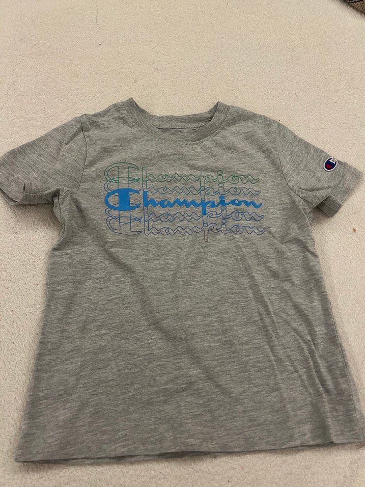 Gri renkli, kısa kollu, yuvarlak yakalı ve bol kesim Champion baskılı erkek çocuk tişörtü. Pamuklu kumaştan, rahat sokak stili için uygundur.