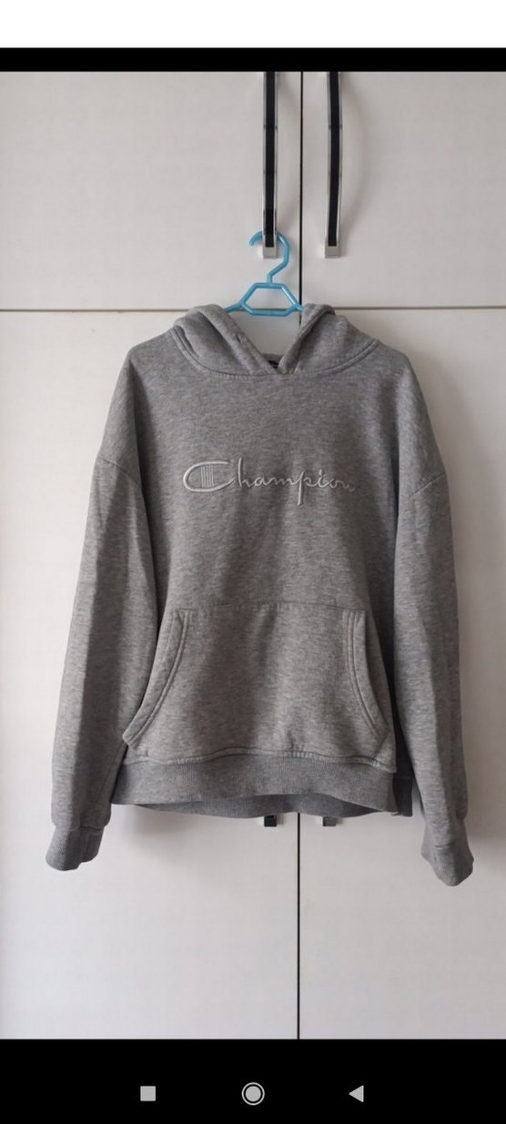 Gri renkli Champion sweatshirt, bol kesim, uzun kollu ve yuvarlak yakalıdır. Yumuşak ve sıcak kumaştan üretilmiş, önünde nakışlı marka logosu ve kanguru cepli.