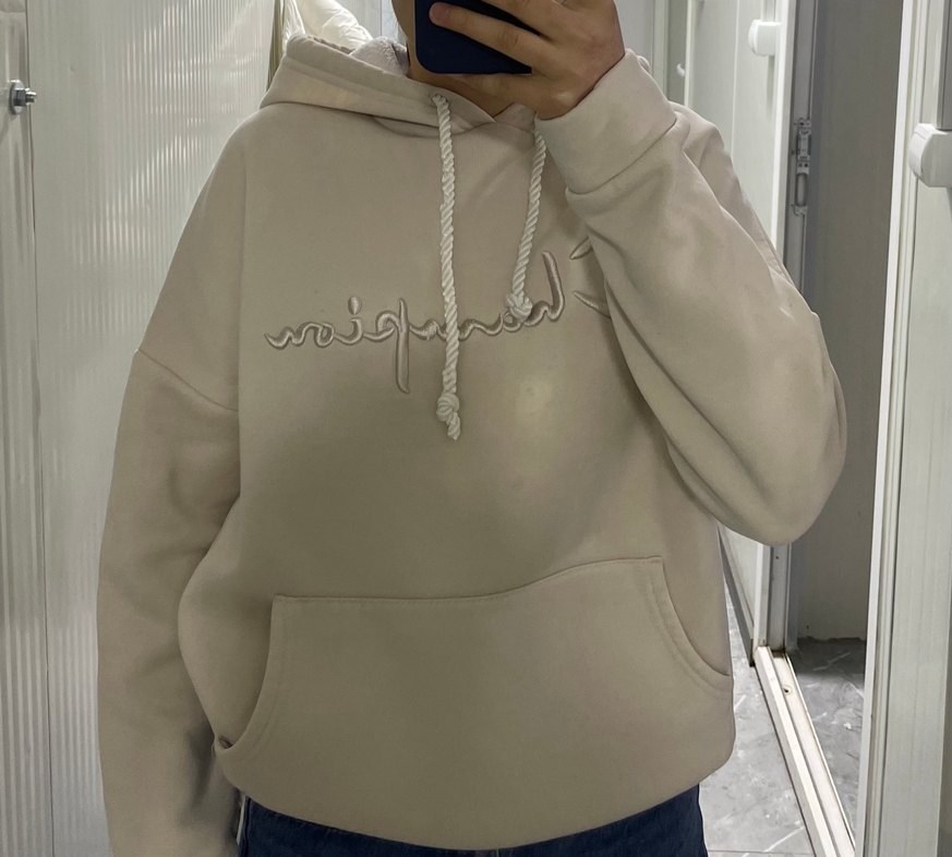 Bej renkli, kapüşonlu ve bol kesim sweatshirt. Uzun kollu, desen içermeyen ve ön cepli, yumuşak ve sıcak kumaştan üretilmiştir. Günlük kullanıma uygundur.