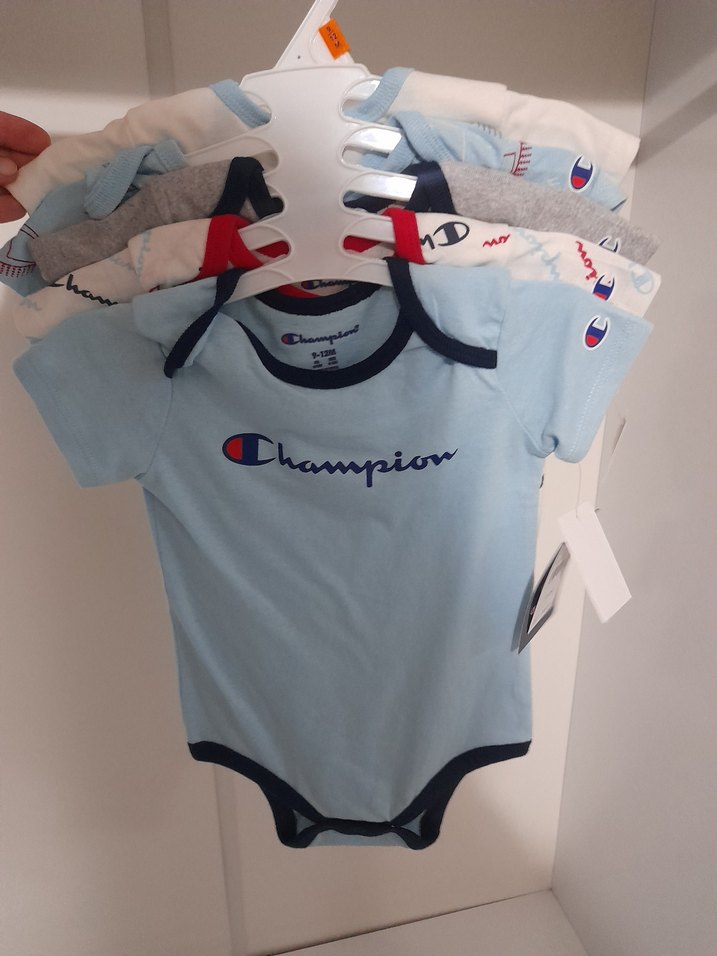 Champion marka, kısa kollu, yuvarlak yakalı ve baskılı logolu yumuşak pamuklu mavi bebek body.