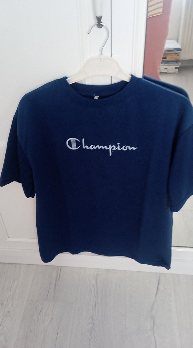 Pamuklu kumaştan, kısa kollu, bol kesim mavi renkte Champion baskılı kadın tişörtü. Yuvarlak yakalı, günlük kullanım için rahat ve şık görünümlü.