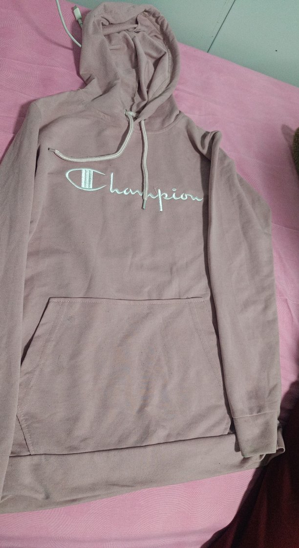 Champion pembe kapüşonlu sweatshirt, uzun kollu ve bol kesimdir. Önde cep ve fermuarlı detay bulunur, yumuşak sentetik kumaştan üretilmiştir. Rahat sokak stili için uygundur.