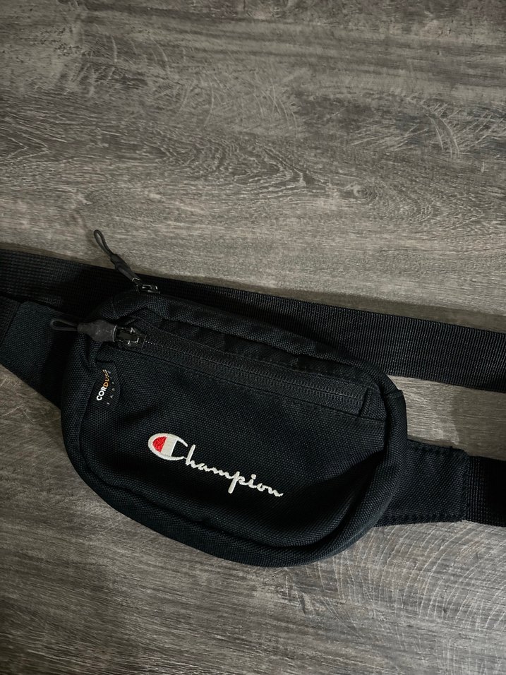 Champion marka siyah bel çantası, kemerli tasarımı ve ön fermuarlı cepleriyle sokak stili ve athleisure için uygun.