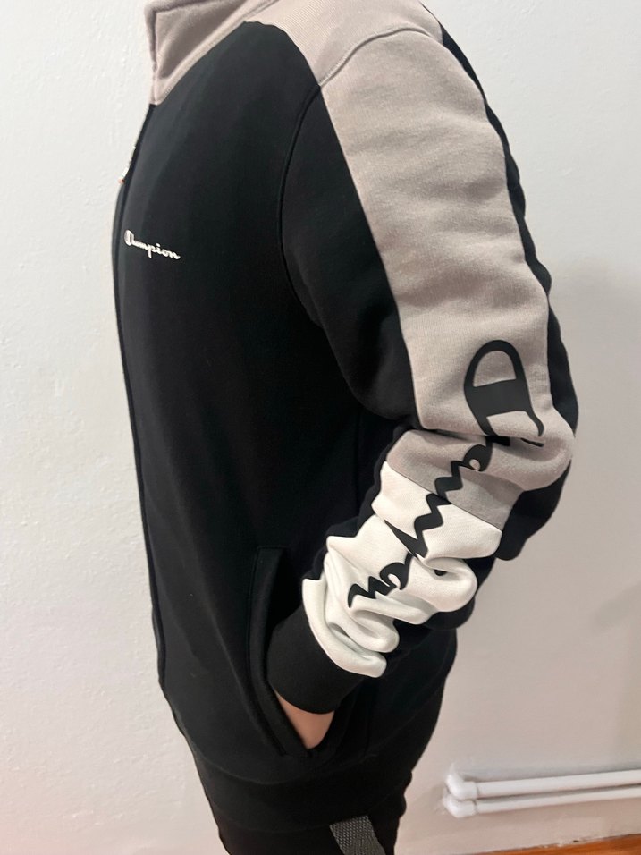 Champion marka, fermuarlı, uzun kollu, bisiklet yaka, siyah ve gri renkli, baskılı, rahat kesim kadın sweatshirtü. Yumuşak ve sıcak kumaştan üretilmiştir. Yeniden farksız orjinal marka