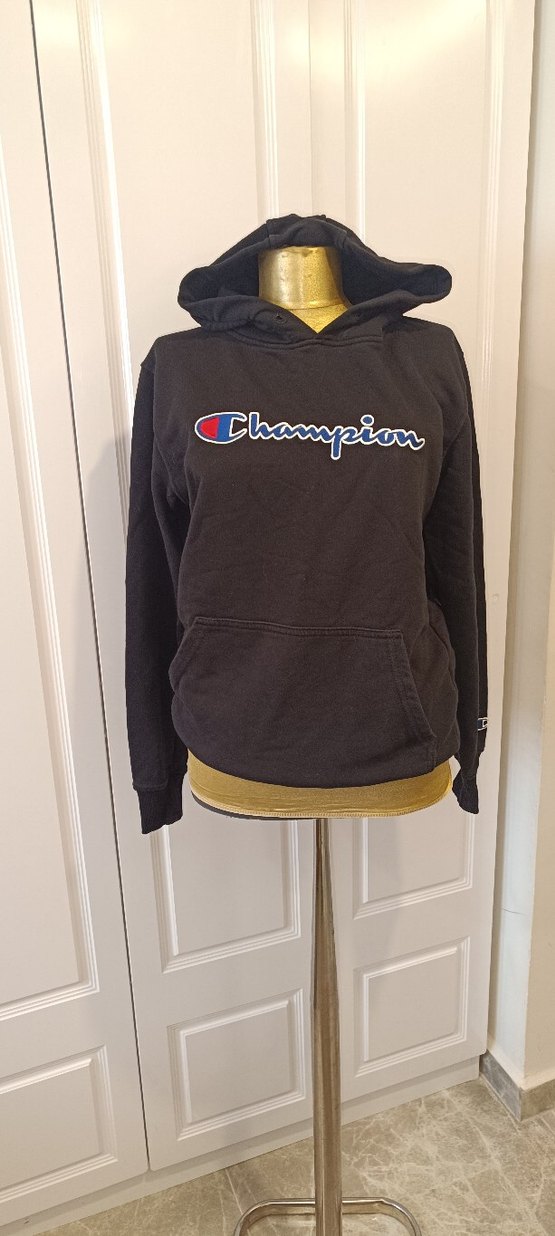 Champion siyah kapüşonlu sweatshirt, uzun kollu ve bol kesimdir. Önünde baskılı logo detay bulunur, yumuşak kumaştandır. sardonlu