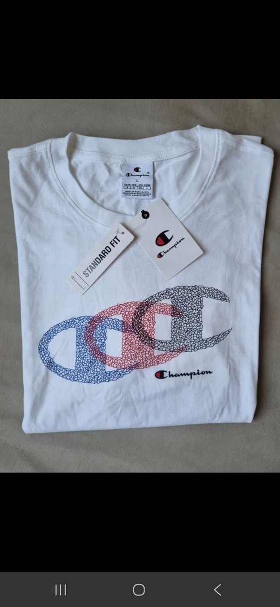 Champion marka beyaz erkek tişört, kısa kollu ve yuvarlak yakalıdır. Pamuk kumaştan üretilmiş, mavi, kırmızı ve siyah baskılı logo desenine sahiptir. Günlük ve rahat kullanıma uygundur.