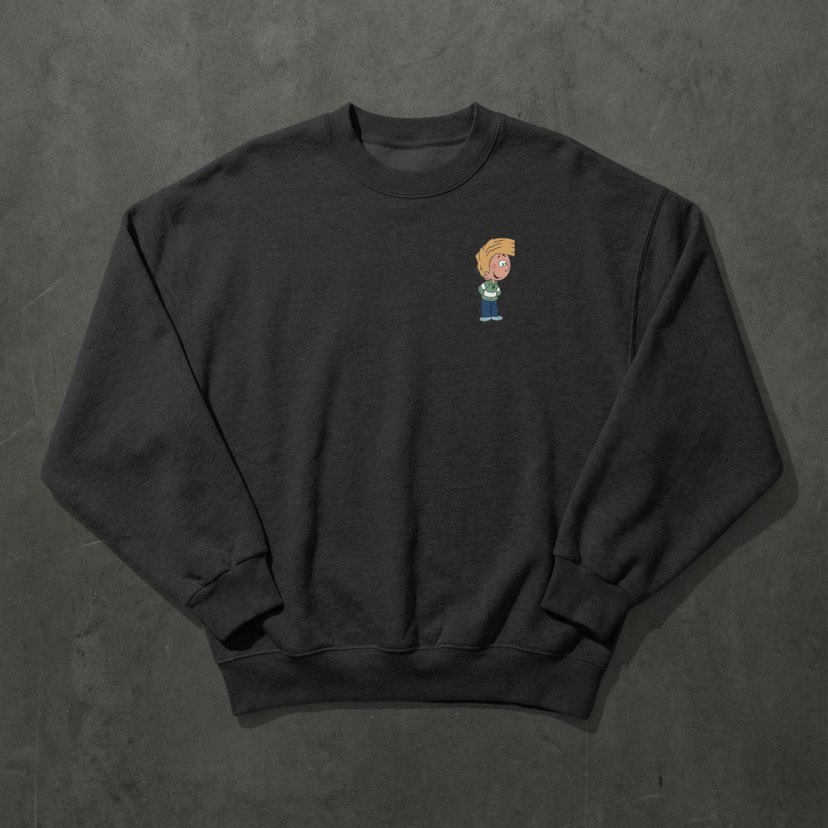 sweatshirt, yuvarlak yaka ve uzun kollu, rahat kesimdir. Yumuşak kumaştan, gri renkte ve küçük baskılı detaylıdır. Günlük ve sokak modası için uygundur.