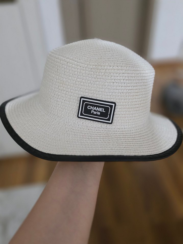Pamuklu beyaz şapka, siyah kenar detaylı ve Chanel Paris etiketiyle, rahat ve şık sokak stili sunar. çok iyi durumda