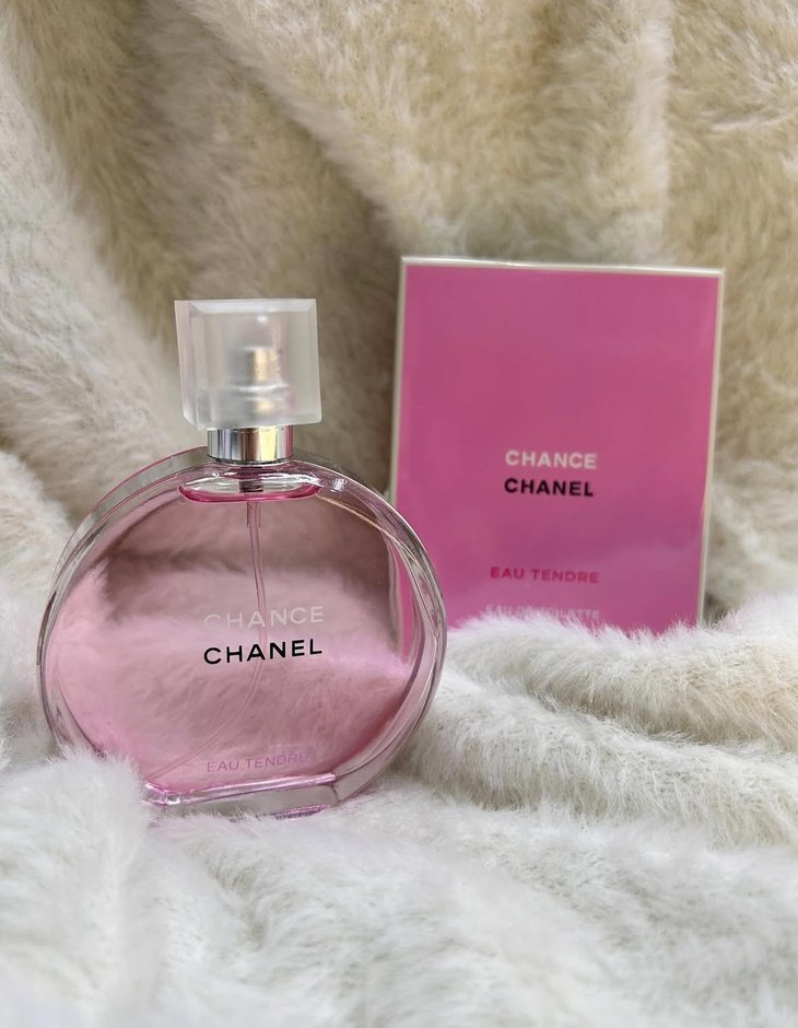 CHANEL Chance Eau Tendre, pembe şişe ve kutusuyla kadınlar için hafif ve taze bir koku sunar.