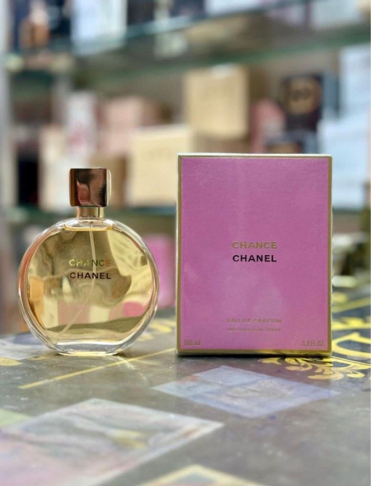 100 ml kapasiteli Chanel Chance kadın parfümü. Yuvarlak cam şişede ve pembe kutuda sunulur. Eau de Parfum kokusu.