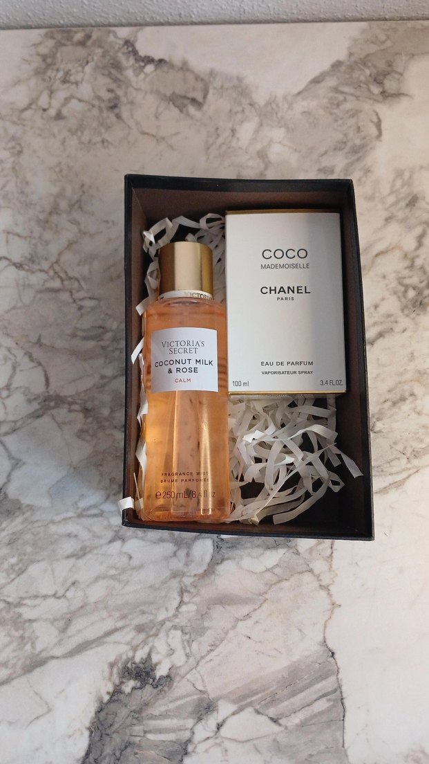 Chanel Coco Mademoiselle Eau de Parfum ve Victoria's Secret Coconut Milk & Rose vücut spreyi içeren parfüm seti, zarif ve ferah kokular sunar.