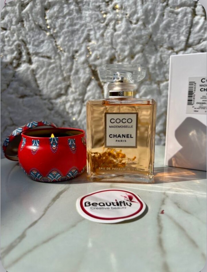 Chanel Coco Mademoiselle kadın parfümü, şeffaf cam şişede klasik tasarımla. Kırmızı dekoratif kılıf ile birlikte.